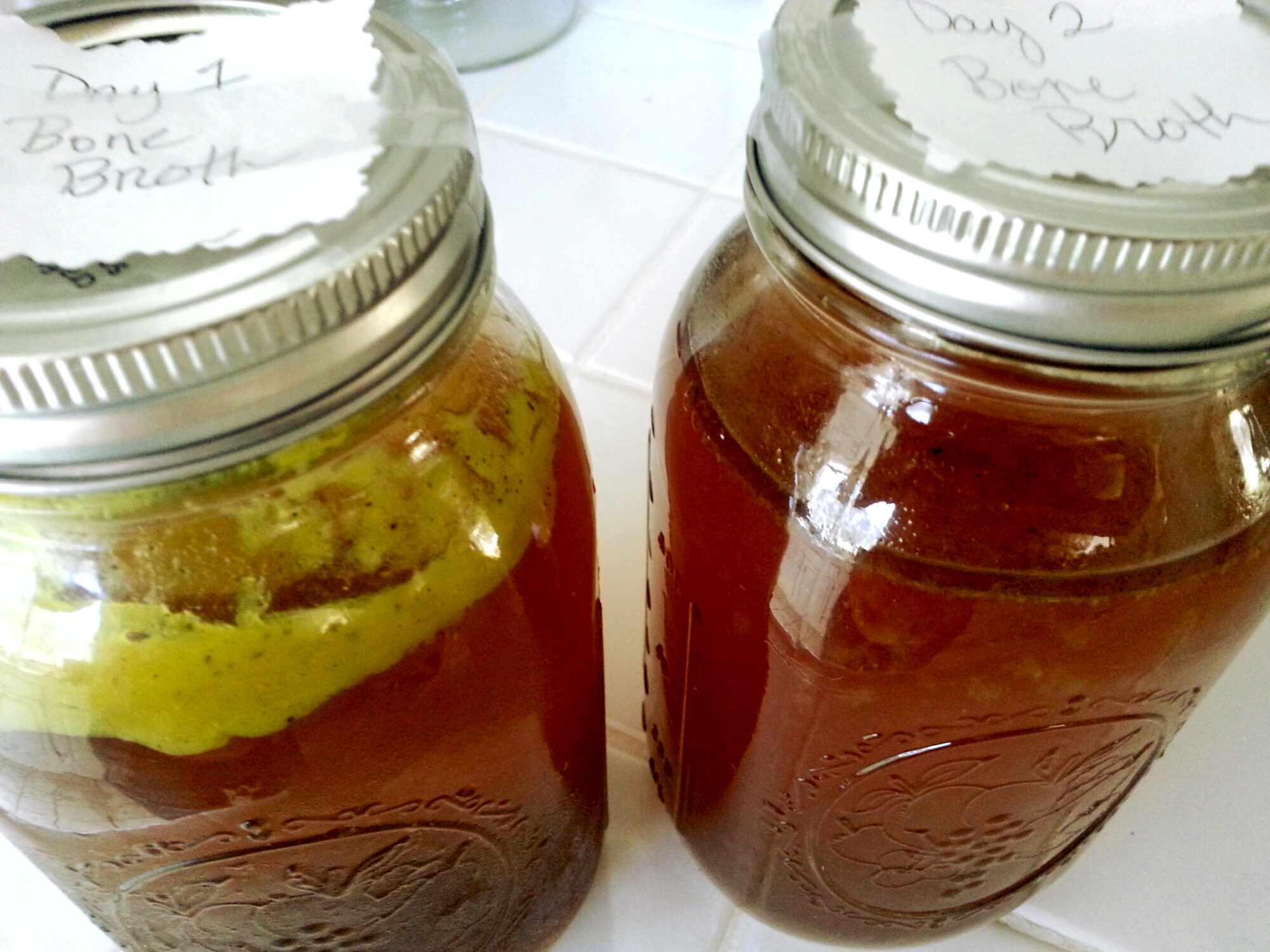 A few hours later I also extracted a large mason jar’s worth of this bone broth and labeled it “Day 1 Bone Broth”. I replaced the missing broth with water and added a few more herbs.