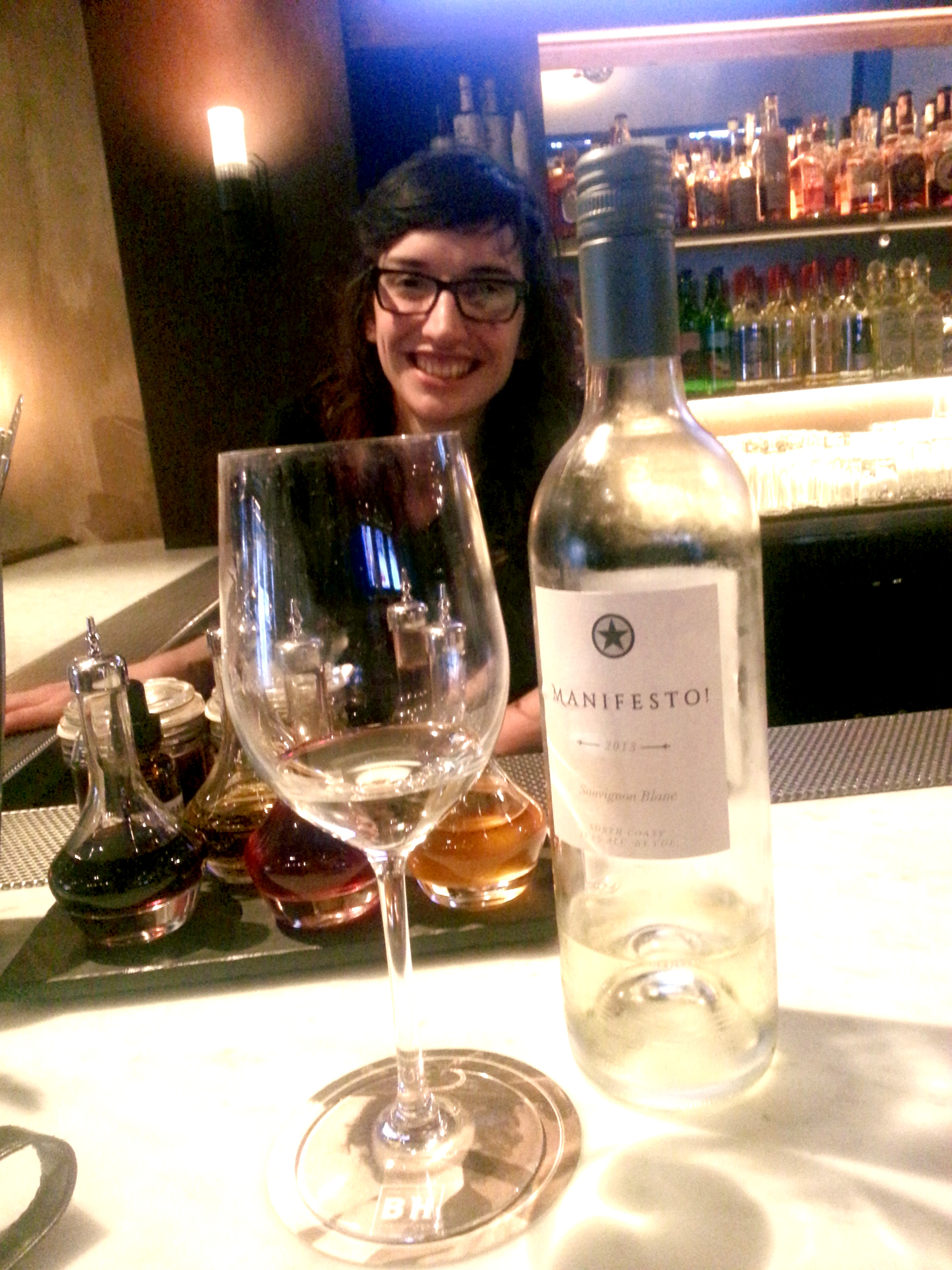 Happy Hour at Bartlett Hall – Waiting on a last late dinner with my husband and some of his colleagues, after some wandering around the city I ducked into Bartlett Hall during their happy hour (M-F 3-6 pm). The prices were excellent. I ordered a Chardonnay, but the bartender suggested the Sauvignon Blanc on the happy hour menu. Very “happy” with it, I asked to see the bottle and struck up some conversation with the bartender. She happily obliged posing for a photo with the wine, which was by “Manifesto”.