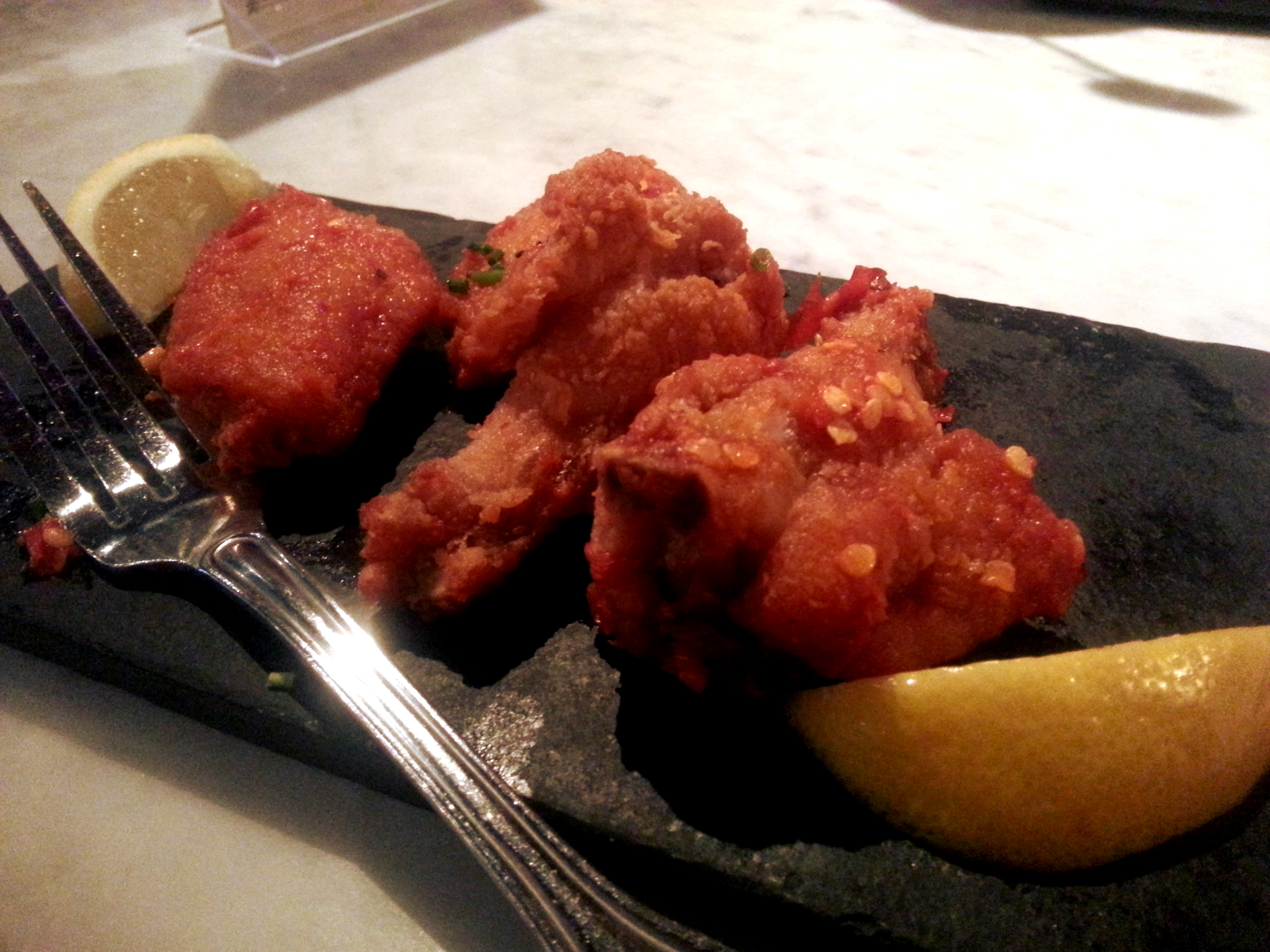 I’ve arrived at the hotel lobby. Having a glass of chardonnay, waiting for my husband and other friends to arrive in the city. This was in the comfy Westin Saint Francis, in the Union Square section of town. The wine is “Magnolia” Chardonnay (made by Chateau St. Jean for Westin) and they brought me some crunchy snack mix in the lounge where I was relaxing with my wine. My friends started streaming in and my husband arrived. Dinner requirements were simple: what is walking distance and has a big table available at 8pm. With stunning ease, we eyed the place across the street and were able to get a table with no trouble and about a five minute wait. This was a Tuesday night, but there was a big conference in town so we were a little worried about waiting hours for a table. Great start to the dining tour!