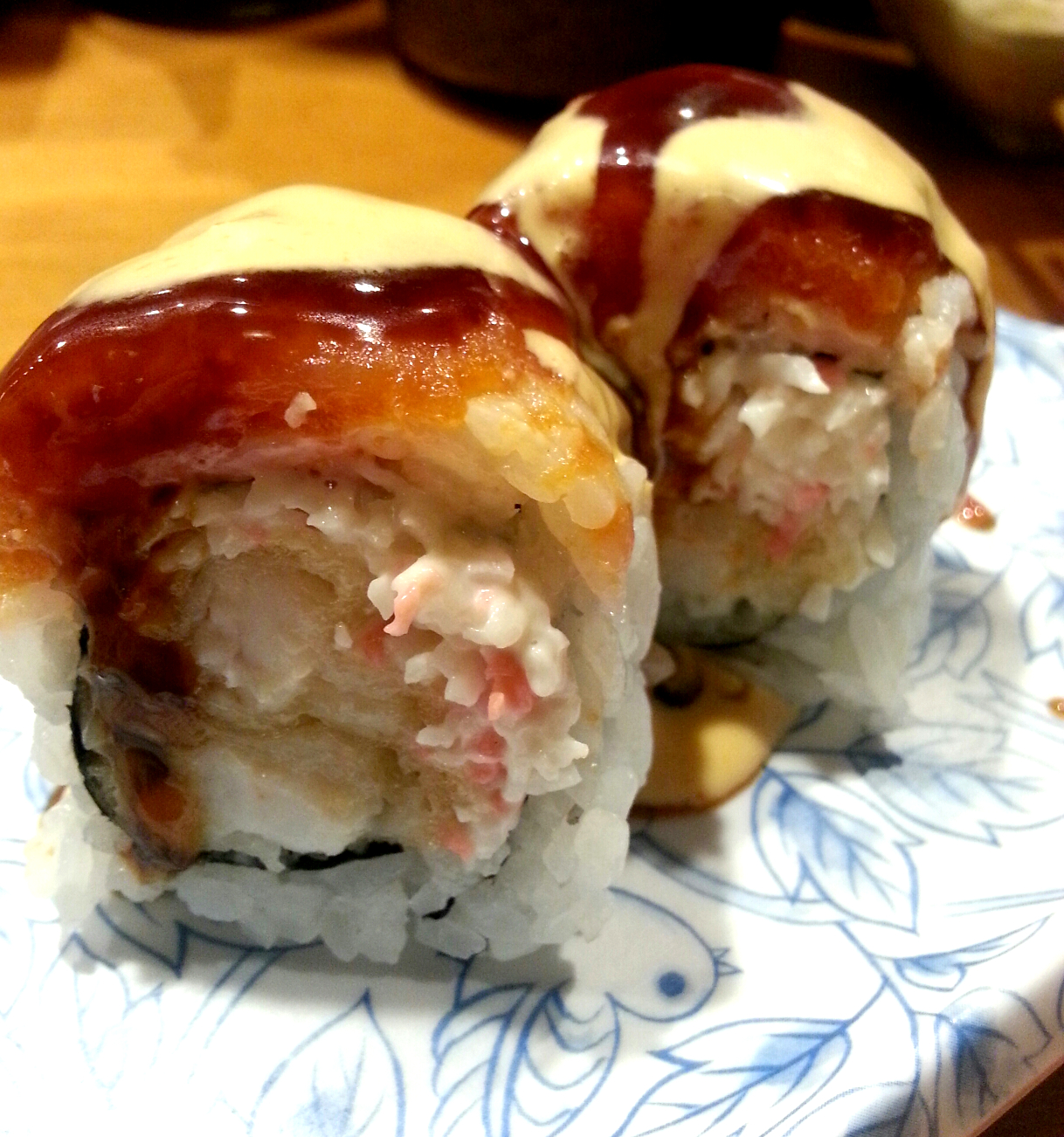 The sushi bar wrapped around a raised area where the chefs were doing their thing. They placed the sushi on little wooden boat trays that rotated around a little mote propelled by little jets in the water. A cute take on the revolving sushi concept. Lots of options too.