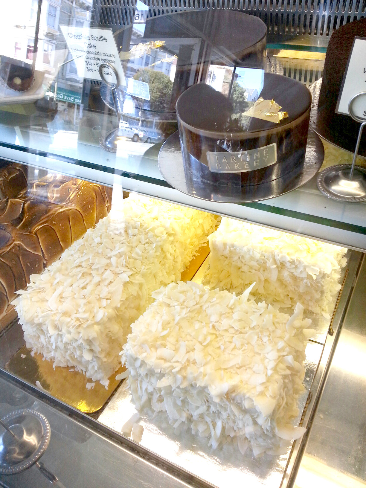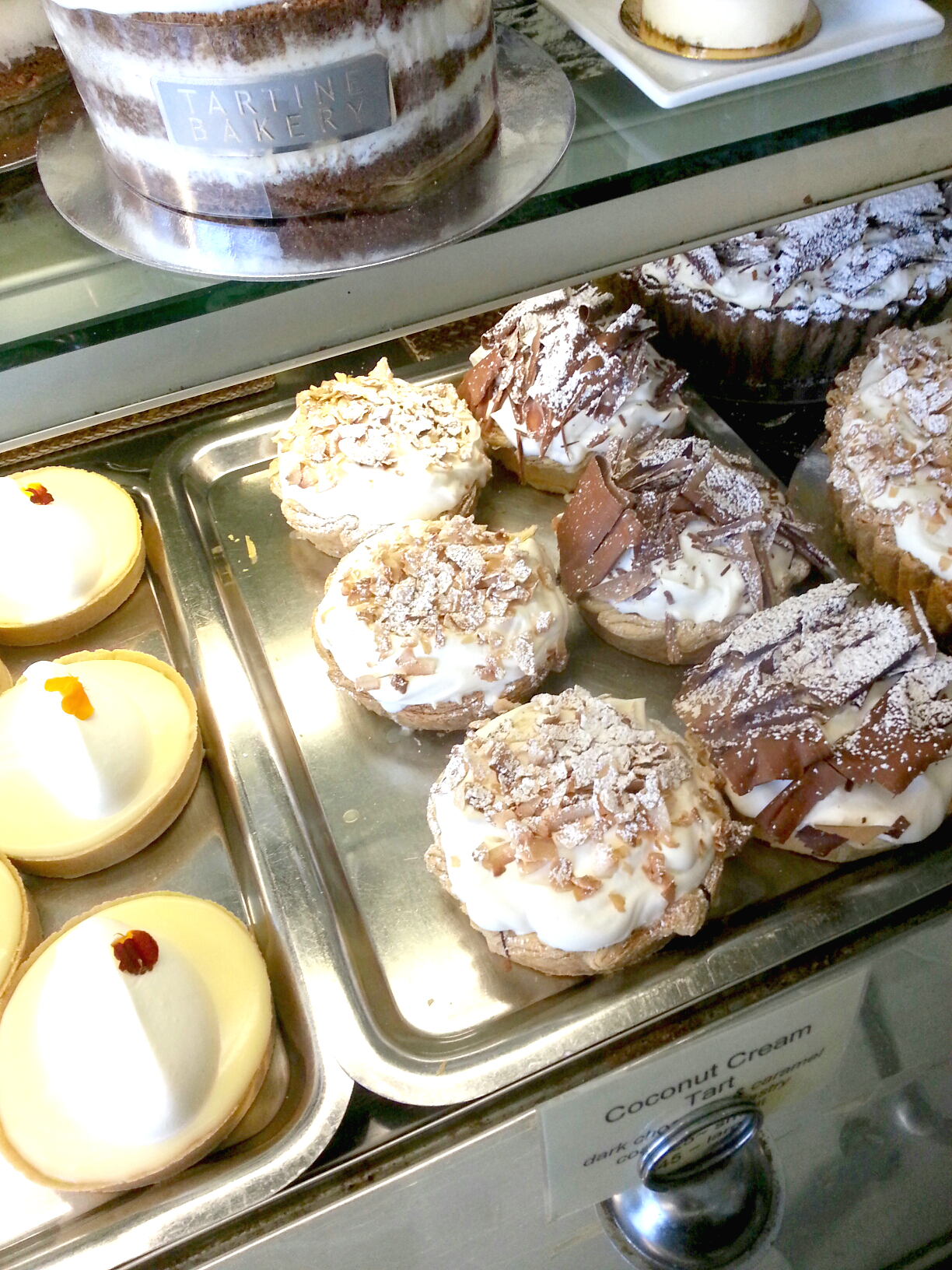 We headed to The Mission. First she took me to the best bakery in San Francisco (according to lots of sources including my dear friend Jill), Tartine. This was more of a quickly make it through the doors before the line got outrageous kind of stop. Treats for later. Frankly, I was overwhelmed by the gorgeous displays of artistic achievements. I’m a cook….and I can bake a few things. But I find pastry chefs and bakers in general to be the mad scientists/artists of the culinary world. This place smelled of vanilla, yeast, chocolate, coffee, ginger and lemon. And the line moved fast. Faster than a new food blogger could snap all the pictures I wanted. But I got a few. And yes…the tasting later was as good as you’d imagine from the pics. I must admit that I didn’t catch the names of each of the following treats: