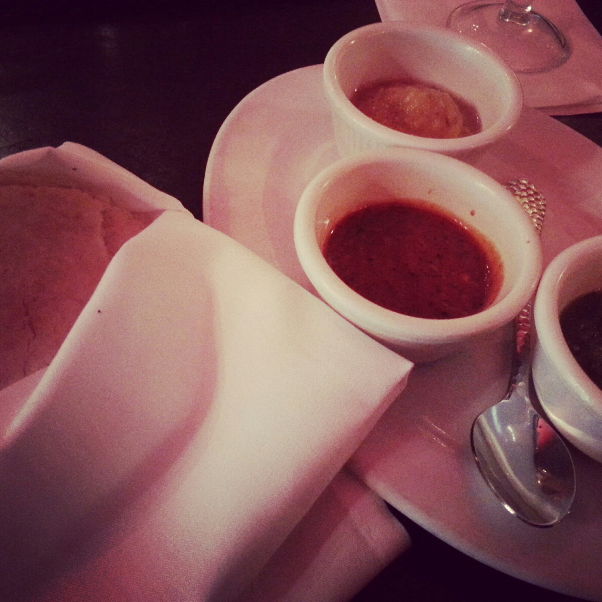 As I waited for my soup, I was given a napkin wrapped around hot house made corn tortillas, accompanied by three salsas. The green, a spicy jalepeno, the deep red a smokey red pepper, and the orangey yellow a mango and pineapple with lots of garlic. Each perfect in its own way, and made better by the combo of them all. The tomato based soup did not disappoint either. Plenty of flavor and the garnishes in the middle hid some delicious al fresco cheese that is maybe the best al fresco I’ve ever had. Always interesting to see the different takes on “Tortilla Soup”.