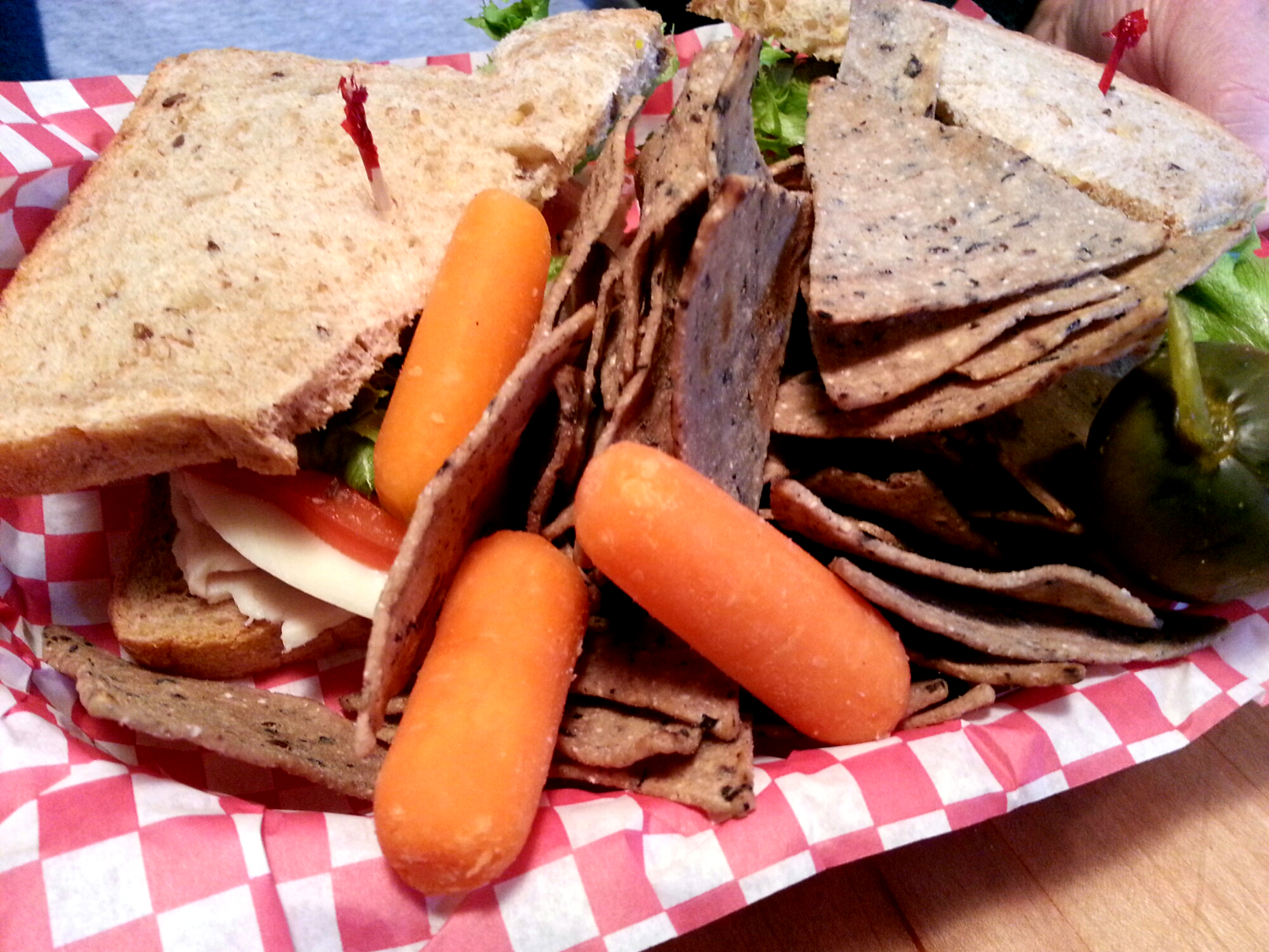 The front of the retail Bob’s Red Mill in Portland, Oregon.Rumor has it Bob (in the picture) hangs out at the store, and willingly poses for pictures if you catch him. He wasn’t around when I was there, but I’ll have to go back and try my luck again. Bob gave his company to his employees after all. He must be pretty awesome.This is a view of the store from the second story loft area where there were tables set up. Because you can order food to eat there! Yummy soups and sandwiches, of course. Whole grain chips and fresh veggies. Even wine and beer. This place gets better and better.If you could trade cows for magic beans, this would be the place to do it.Every type of flour and grain you can think of. I bought pumpernickel and rye flour among others, because I want to try making both types of bread.A cold turkey sandwich with whole grain chips and carrots.Their French Dip measured up with the best of them. This was my lunch.Spending time in the store is really easy. I could have spent hours. Everywhere you look is some helpful hint or free recipe. There are even giant cookies, loaves of bread, bulk goods, spices, and the nicest employees always in sight in case you’re overwhelmed, have a question, or just want to comment on the curious number of whole, nutritious ingredients everywhere you look.We didn’t do the Mill Tour. But next time I go to see my family I will go. If I know in advance, I’ll happily announce here and on facebook (facebook.com/mdelishboutique) so my Portland readers can join me! Sounds like a good opportunity to me!Hello! Guess who already has a dream list in the works? I just have to get through all the amazing things I bought while there….watch for my blog post with all the plunder and what I did with it!