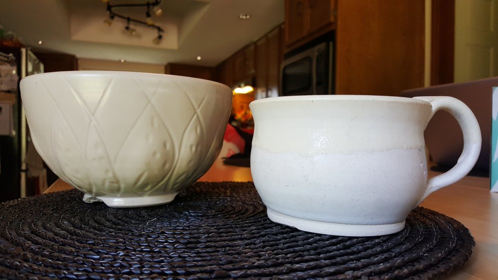 Once we picked out our bowls, we were given a ticket for soup and paid for our bowls, got them washed and picked out soup and bread. My bowl is a beautiful soup mug with a pretty light eggshell glaze. My husband picked out (or did I pick it out for him?) a larger bowl that is suitable as a serving dish. There is a textured pattern around the sides comprised of primitive looking fish.