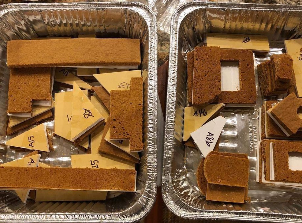 This is the mixing station. Once mixed, each batch bakes for 20 minutes and then Lindsey quickly cuts the pieces needed for the build.