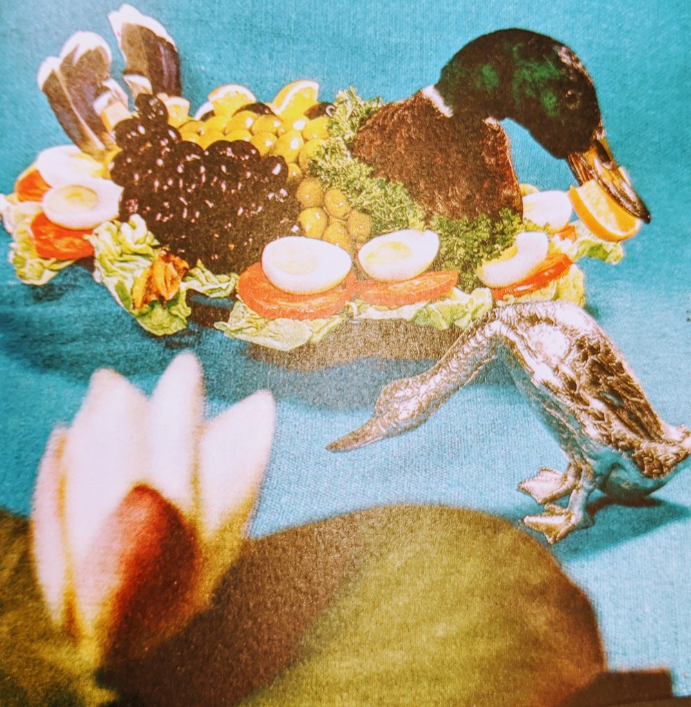 If you like your cauliflower served in a golden shoe atop a loaf of Roquefort, you’re in luck. If you enjoy guessing the ingredients to a pastry dessert that looks like a wishing well simply for the reading pleasure, this is the book for you. If you wish you had a template for creating a potted duck with olives (a real duck, re-sculpted in an amazing array of antipasto garnishes)…and holding a wedge of orange in its bill), why, look no further.