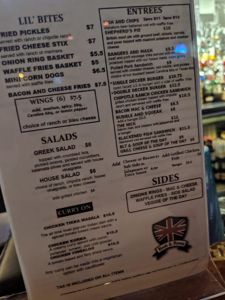 Nosh & Bevvy is a no-frills London-themed dive bar with the best bartenders around. After my first visit, they knew what I liked and how I liked it and I rarely had to specify what I wanted, unless I changed it up and explored the menu more. However, with the curry on the menu, that was rare. Order it with mixed vegetables added, extra raita and a basket of chips (french fries) to dip in the sauce. You can thank me later. The Shepherd’s Pie (well, technically Cottage Pie, as Shepherd’s Pie is made with lamb, but who’s counting) is also lovely and comes covered in cheese, which I wanted to be mad at but just couldn’t be.