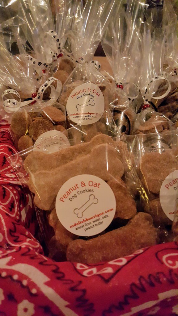 These treats are VERY EASY to make. If you want to make them with cookie cutters into cute shapes, you can do that by all means. I like to give them as gifts that way, but for my dogs, I just roll out little olive-sized balls because not only is it easy, there are more treats to hand out and less calories (labs can tend to get a little overweight if you’re not careful).
