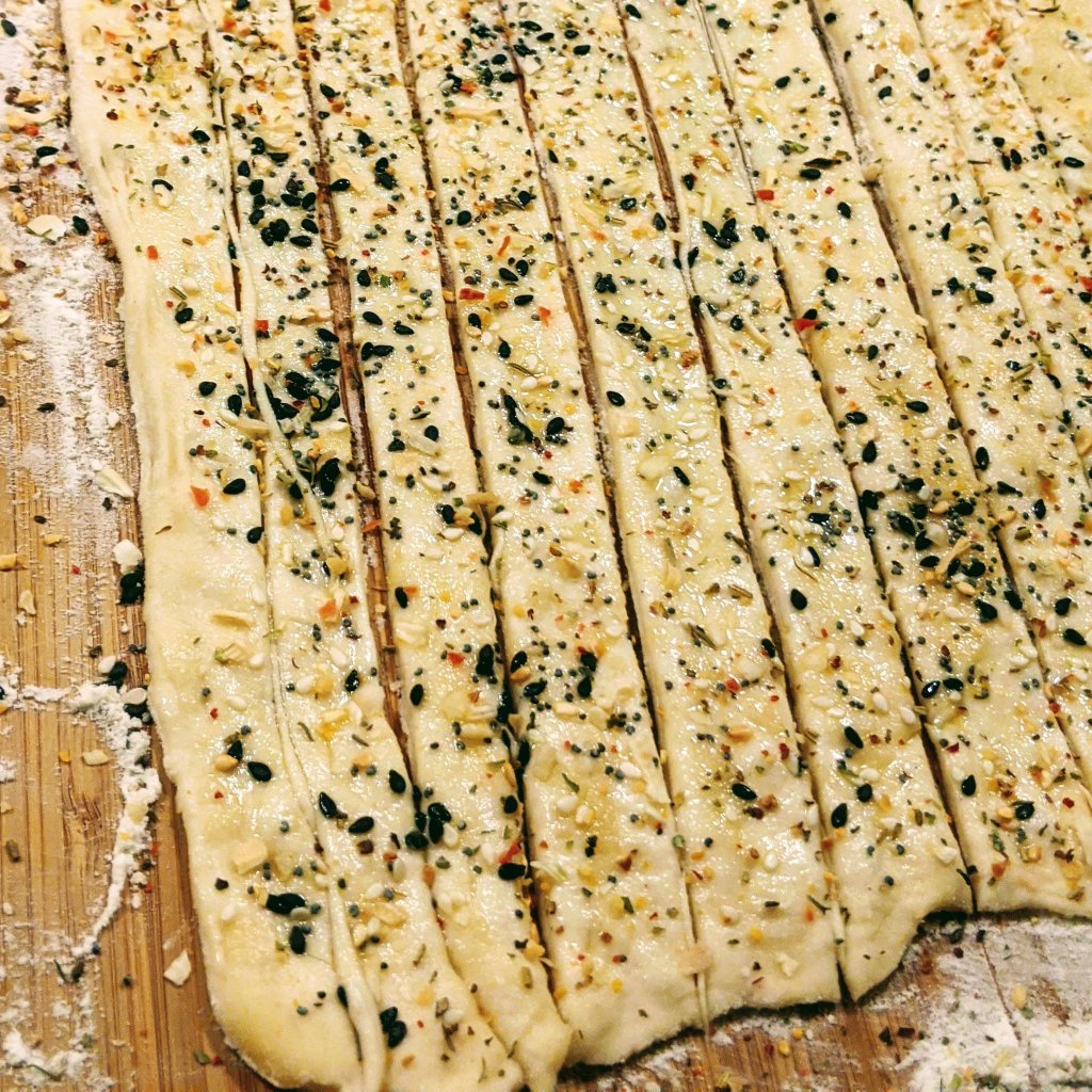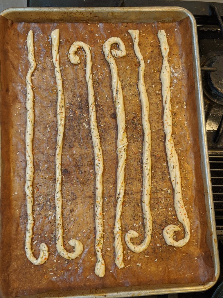 June 9 – I’ve made several batches now of my favorite way to use up my sourdough discard: Grissini. Grissini are thin, super crispy breadsticks that can be seasoned in all kinds of ways. My latest favorite is dill and garlic with fine black pepper and a dusting of salt. I first made them because they are so eye-popping and I wanted to see if I could figure out a ratio of discard to flour and water from the standard recipe. My first batch tasted delicious, but I found the dough a little too “thick” I guess. So my second batch I added less flour in the kneading stage and let it be a little on the sticky side on the way to the two-hour rest. I was happy with that, even though the dough was a little limp. I just folded each strip over and twisted along to get them longer. It kind of also added a cool element to how they look because the seasonings were inside the fold and sort of seeped out. These things are fun because they’re flexible to experiment with and they never taste or look bad. Check out my recipe and let me know what you think.
