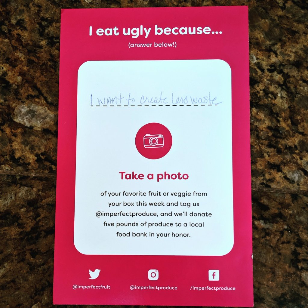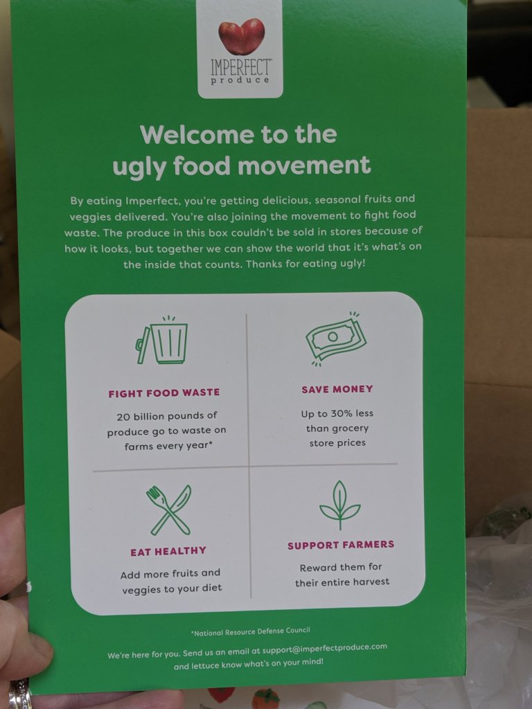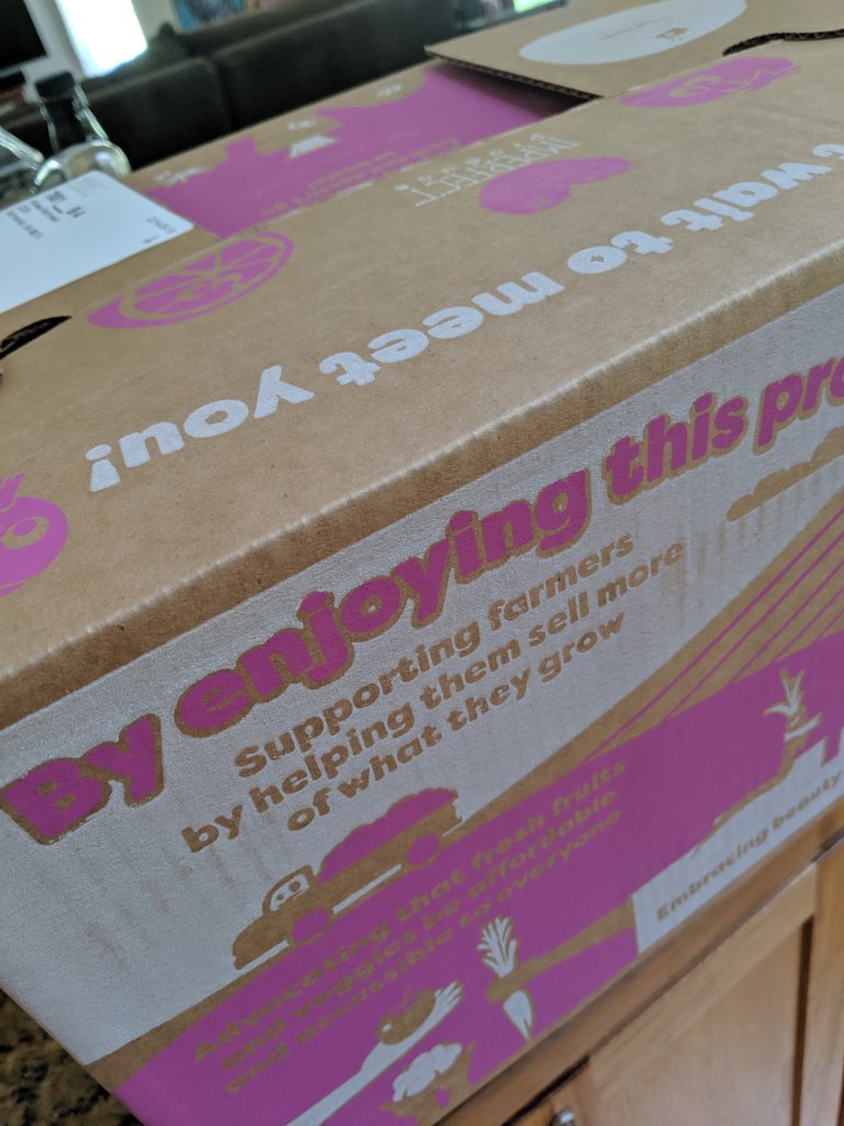 Top that off with that the first order I placed was at a discount due to a code a friend shared with me which saved us each $10 on a box. And when I got my box I had the option to choose which food bank near me to which Imperfect would donate five pounds of food.