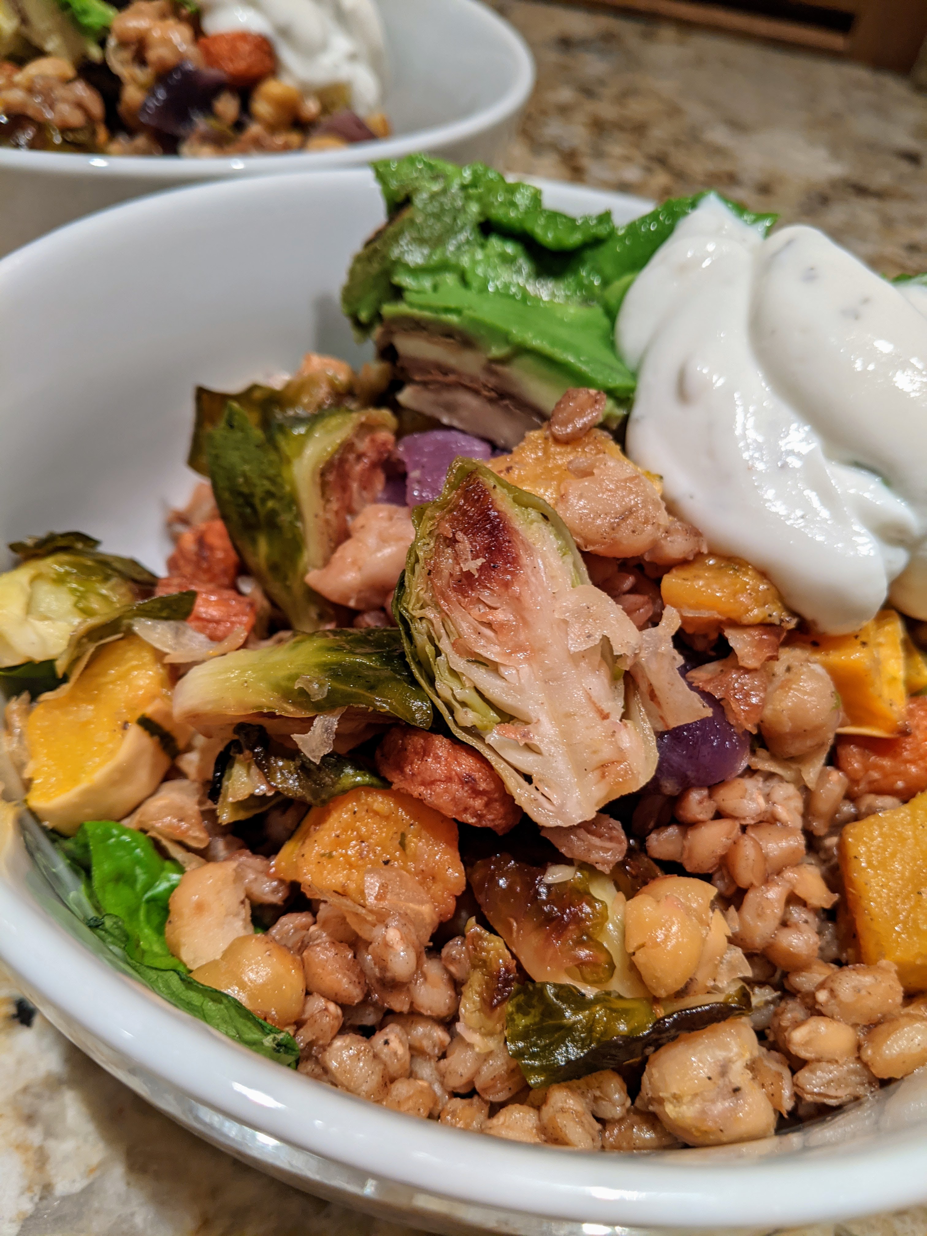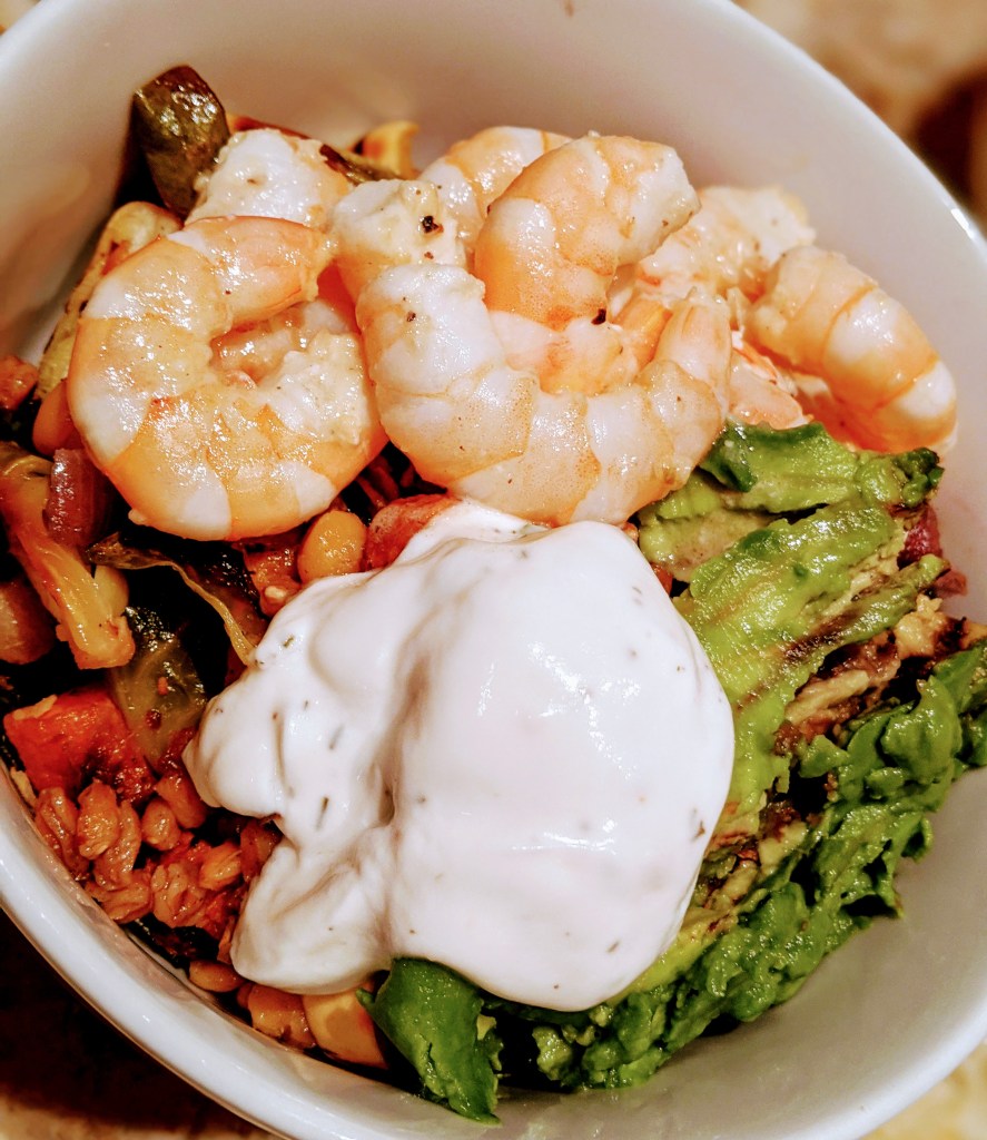 - In bowls or prep containers, layer farro, roasted vegetables, shrimp, avocado, and then dollop with dressing.