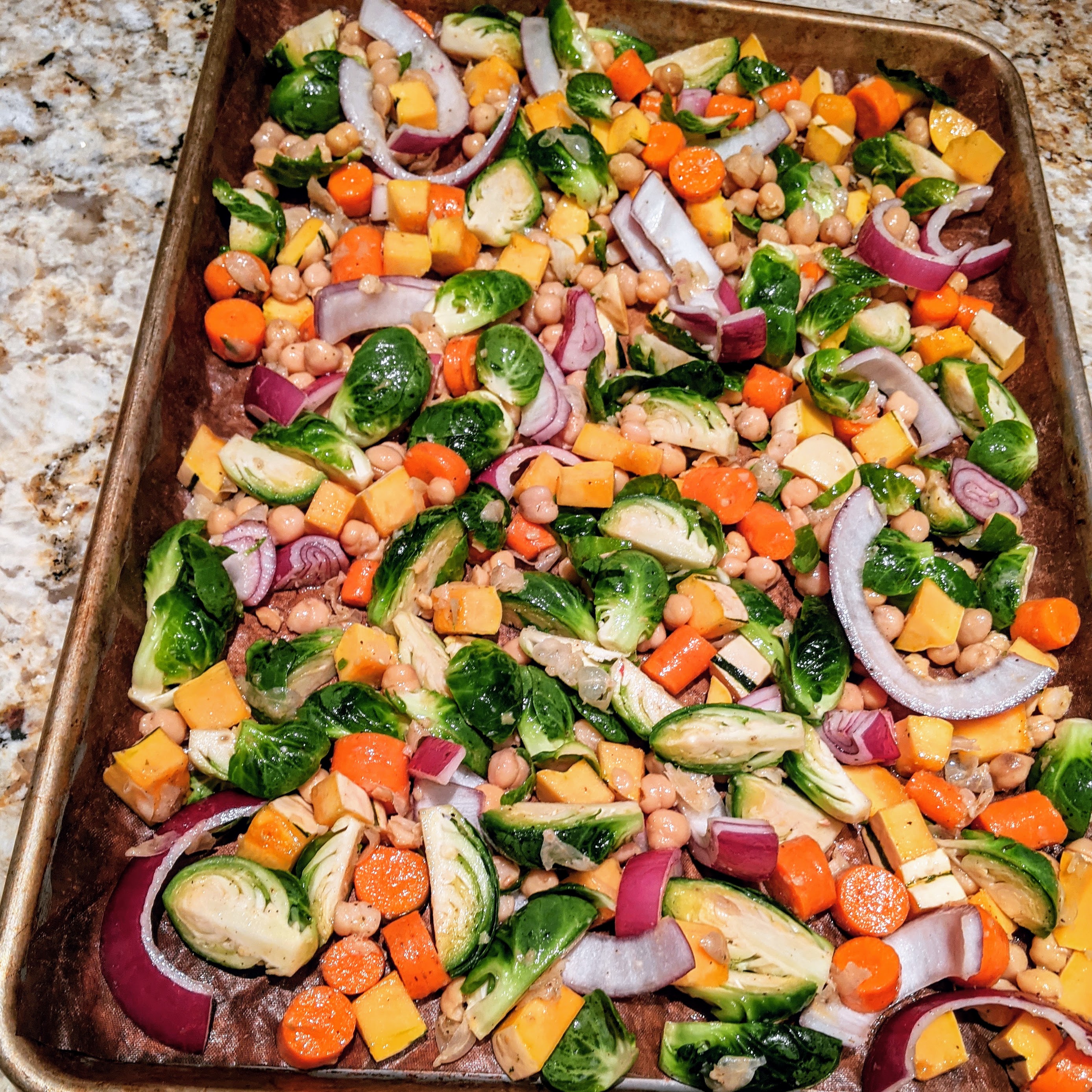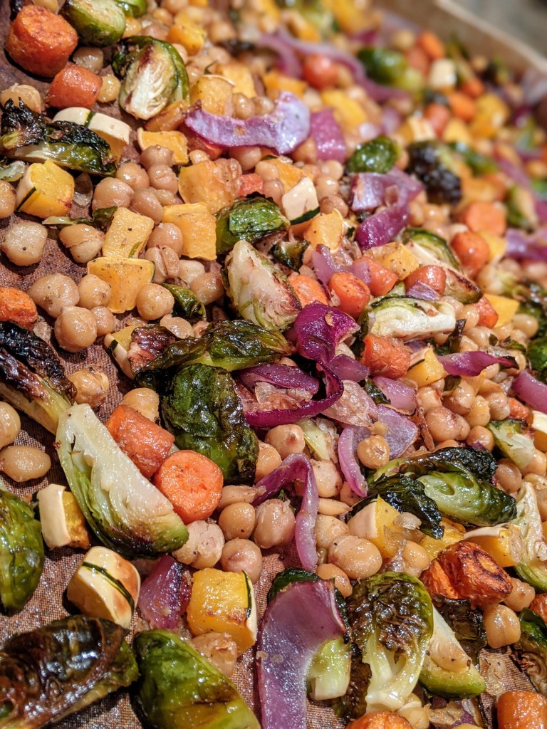 - Line a baking sheet with parchment. Toss all vegetables in oil and one teaspoon of salt. Spread onto baking sheet. Roast about twenty minutes or so until veggies are browned. Chickpeas should be crisp.