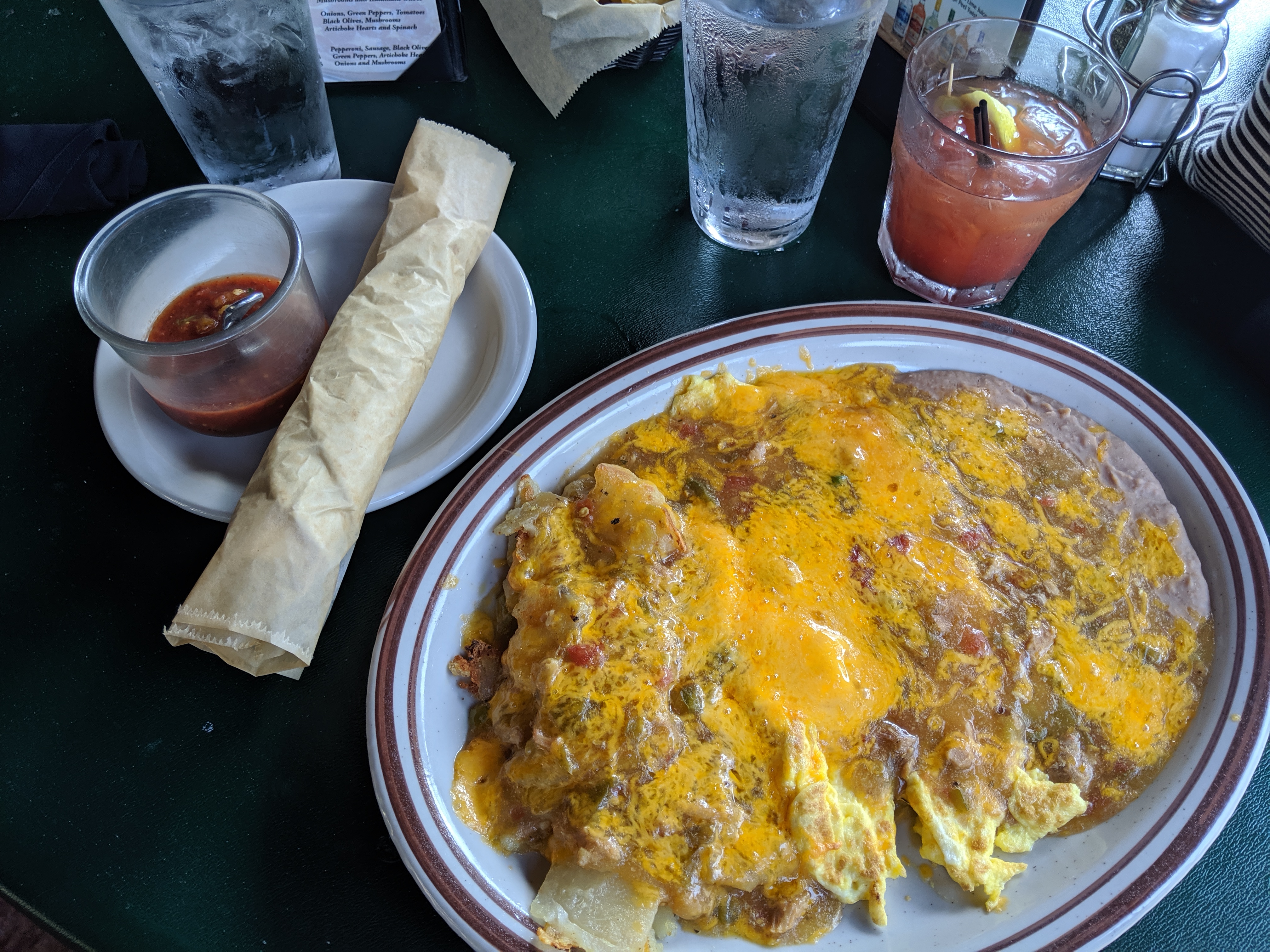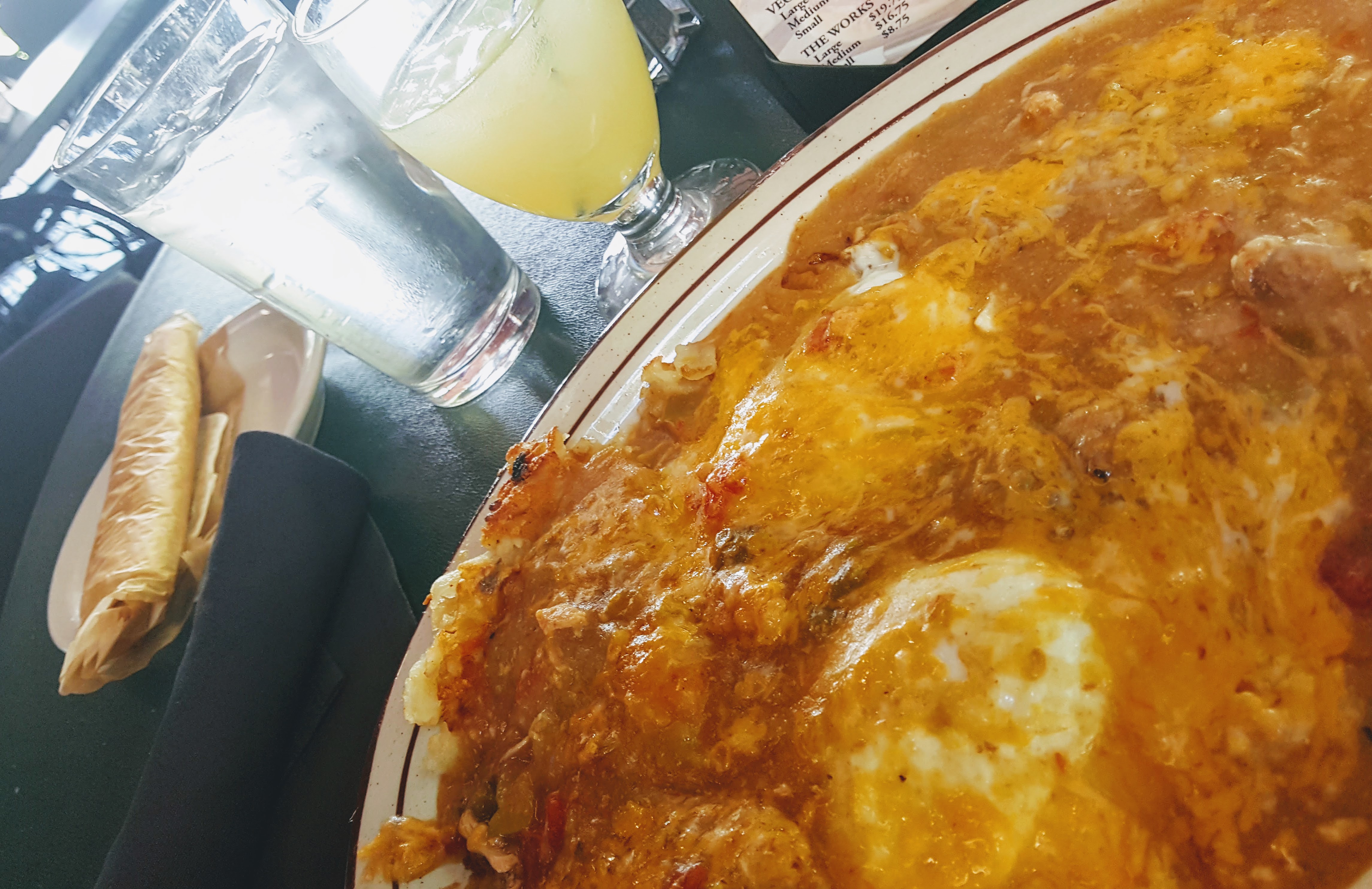 - Huevos Rancheros smothered in green chili sauce, cheddar